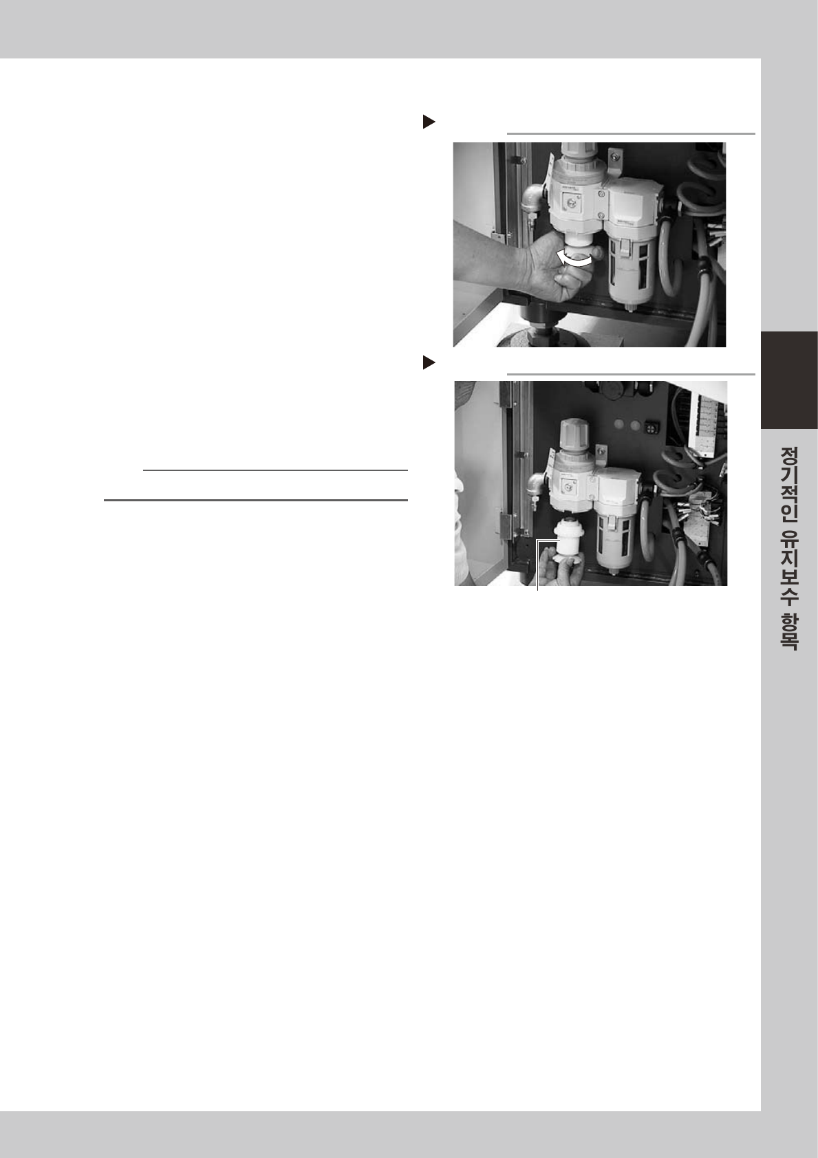 3-18 3 2 . 9 에 어 / 수 분 필 터 점 검 • 청 소 에어 컴 프 레 서 안 의 오일 , 수 분 , 불 순 물 등 이 장 비 안 으 로 유 입 되 지 않 도 록 , 에어 / 수 분 필 터 를 사 용 하 고 있 습 니 다 . 이 필 터 의 점 검 • 청 소 방 법 을 다 음 과 같 이 설명 합 니 다 .( 에 어 커 플 러 에 서 가 까 운 쪽 이 에어 필 터 , 먼 쪽 이 수 분…