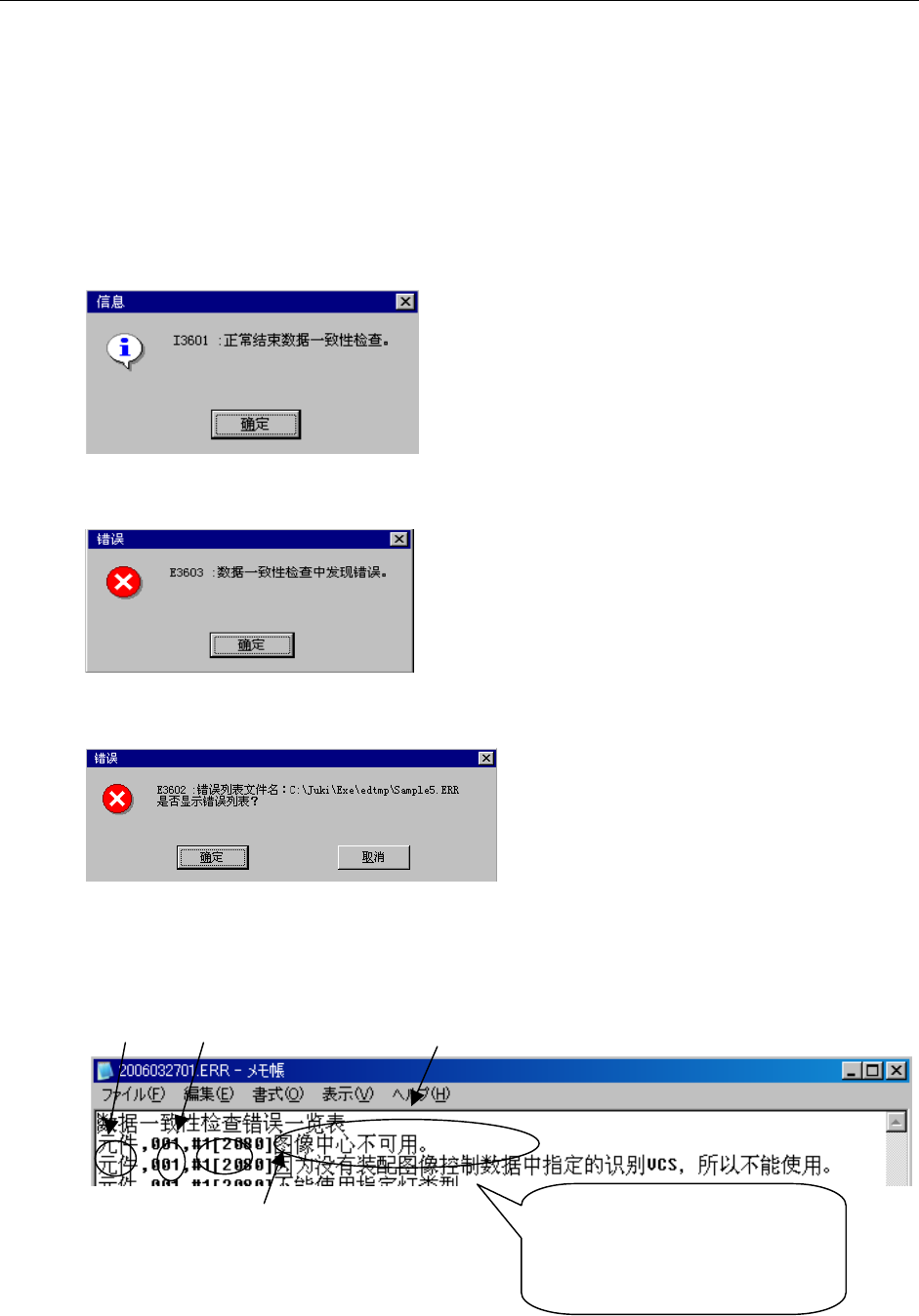 操作手册Ⅱ Rev01 2-110 2-3-10 数据一致性检查 检查已制作的程序和机器设置中的设置内容是否矛盾,并检查程序本身是否矛盾。 一致性检查结束后,即可进行优化。当检查结果显示有错误发生时,则显示错误内容。此时, 请参考显示内容,修改程序或“机器设置”。 1) 执行一致性检查 从菜单栏中选择“数据(D)”/“数据一致性检查(L)”,执行一致性检查。 2) 检查的结果报告 进行一致性检查后,显示如下信息。 ① 正常结束时 ② 检…