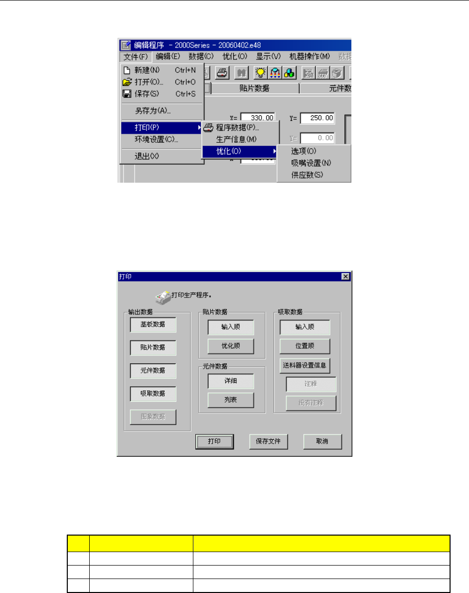 选择“文件”/“打印”,从“程序数据”、“生产信息”、“优化”中选择要打印的项目。