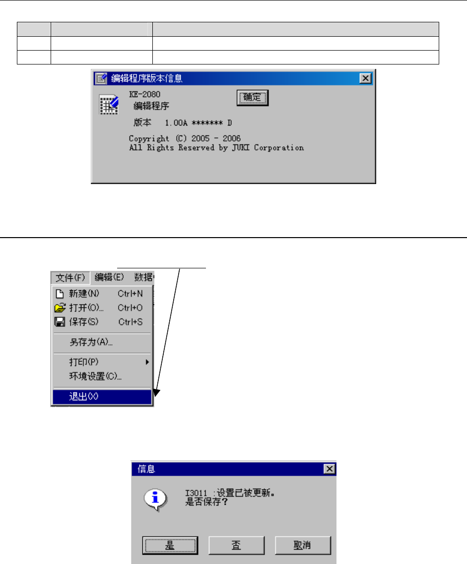 操作手册Ⅱ Rev01 2-165 2-5-6 帮助 No. 帮助组 说明 1 帮助 起动帮助后,显示程序编辑帮助。 2 版本信息 显示关于程序编辑的信息。 图 2-5-50 版本示例 2-5-7 程序编辑的结束 从菜单栏中单击「文件」/「退出」 。 图 2-5-51 退出程序编辑 如果程序中有所变更而尚未保存时,显示如下的确认。 图 2-5-52 结束时确认保存的对话框 ●“是” :进行保存。保存后退出程序编辑。 ●“否” :不进行保…