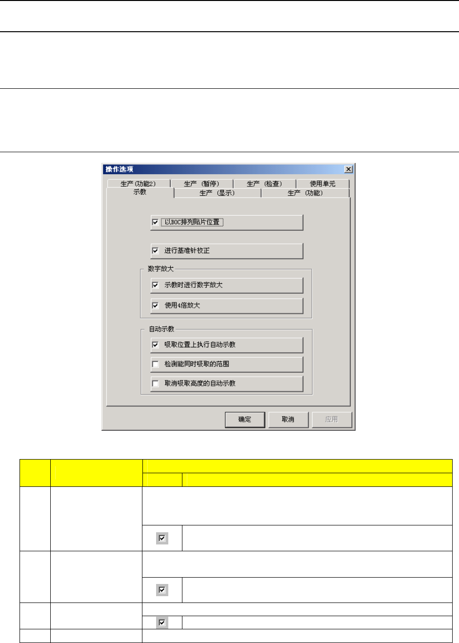 操作手册Ⅱ Rev02 4-27 使用4倍放大 数字放大 4 倍显示。 设置是否在吸取位置上执行自动示教 。 5 自动示教 吸取位置上执行自动 示教 在吸取位置上自动示教。 在选中 「吸取位置上执行自动示教」 的情况下, 还可设置检查能同时吸取 的范围 6 自动示教 检测能同时吸取范围 检查能同时吸取的范围。 在选中「吸取位置上执行自动示教」的情况下,还可设置执行/取消 自动 示教吸取高度 7 自动示教 取消吸取高度的自动 示教 取消自…