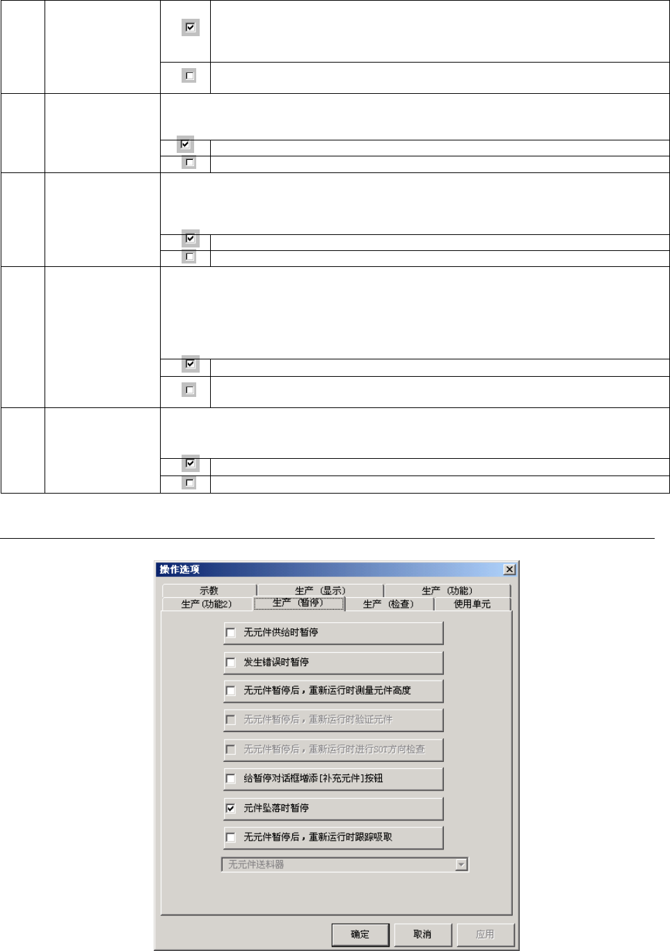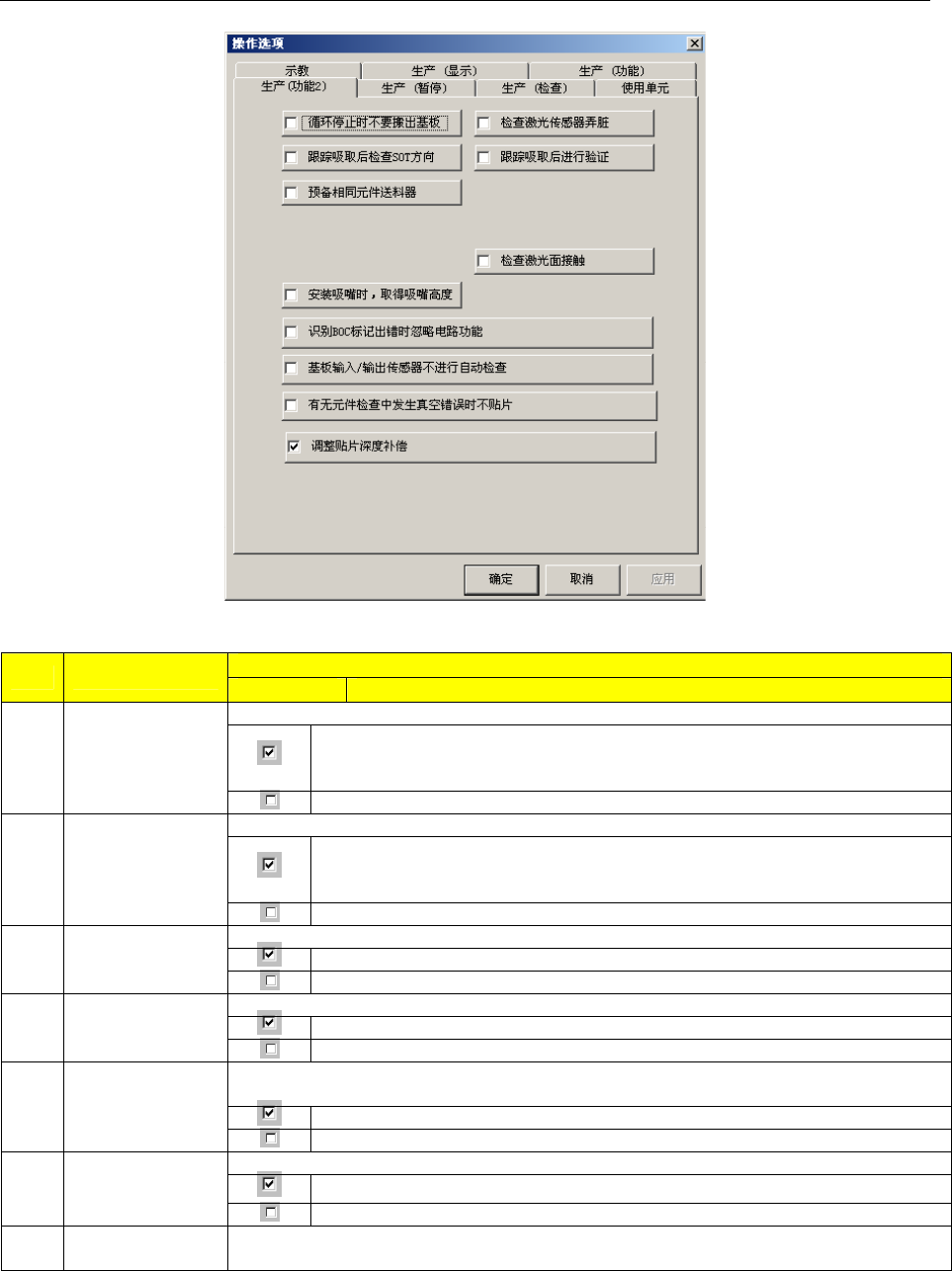 操作手册Ⅱ Rev02 4-31 4-2-2-4 设置生产的功能 2 选项 设置生产时的操作。 图 4-9 生产的功能 2 选项 内容 序号 项目 状态 运行及详细内容 设置在循环停止时是否搬出基板。 在生产中按下单循环键时, 生产一块基板后不搬出 基板, 留在中心站上。 ·释放基板并暂停。 ·按<START>键,再进行生产。 1 循环停止时不 要搬出基板 把基板排出到后道工序后结束生产。 设置基板搬入时是否用激光检查脏污 …