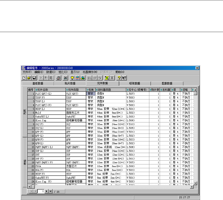 操作手册Ⅱ Rev01 2-29 2-3-5 元件数据 “元件数据”是输入由“贴片数据”输入的“元件名称”的详细信息的数据。 因此,需要制作由“贴片数据”输入的所有元件名称的数据。 2-3-5-1 元件数据画面的显示 元件数据的输入画面,有表格显示和列表显示2种形式。 列表显示画面是将多个元件数据的概要 以列表的形式显示在画面中。在列表显示画面中,不 能输入数据,但可查看数据的完成情况。 图 2-3-2 贴片数据列表画面