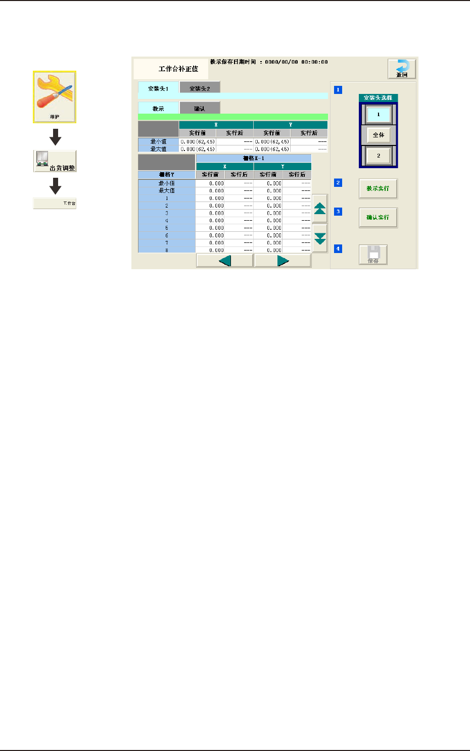 3OM-1752 1-67 • 教示步骤 Procedure (1) 选择教示中使用的安装头。 (2) 选择进行教示的送料器安装台。 (3) 按下 [ 传送带宽度移动 ] 按钮。 ( 传送带向调整位置移动。) (4) 将线路板支撑销教示用治具设置到左上、右下的 2 处。 (5) 选择教示方法,进行教示。 [ 教示实行 ] 按钮选择 :进入步骤 (7) [ 目视对齐 ] 按钮选择 :进入步骤 (6) (6) …