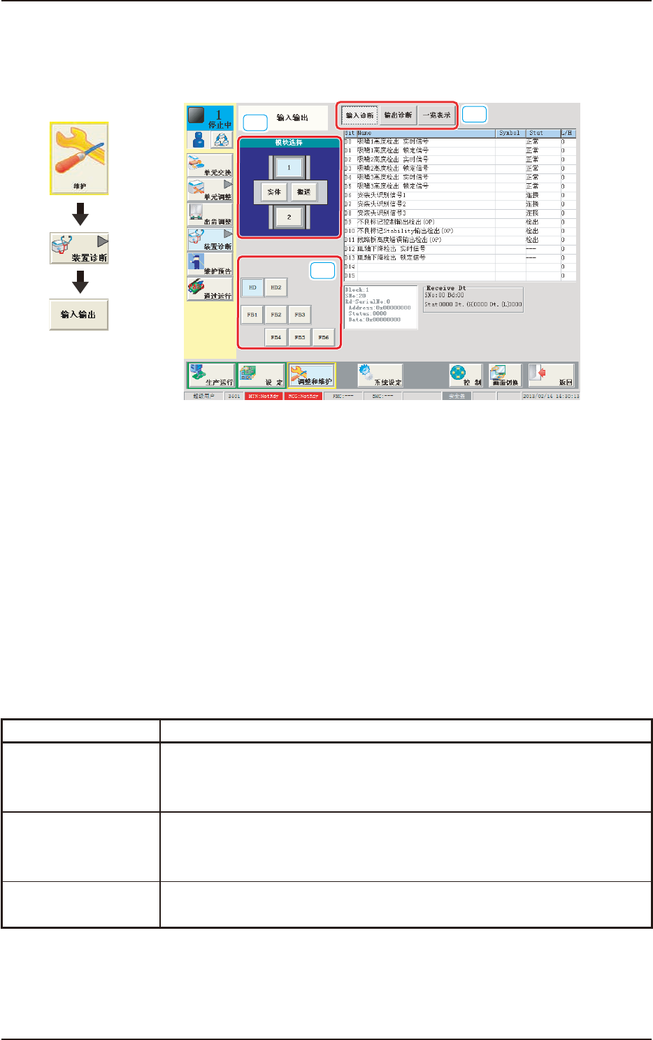 3OM-1752 1-70 6.1 输入输出 诊断各部分的输入输出状态。 [1] [2] [3] F3A50 [1] 模块选择按钮 在装置的图像中显示的各模块被设为按钮。 按下按钮,选择诊断 I/O 状态的模块。 [2] 单元选择按钮 配置有用模块选择按钮选择的模块各单元按钮。 选择诊断 I/O 状态的单元。 [3] [ 显示切换 ] 按钮 按下按钮,显示对应的各界面。 各界面的说明如下 : 按钮 内 容 输入诊断 显示用左…
