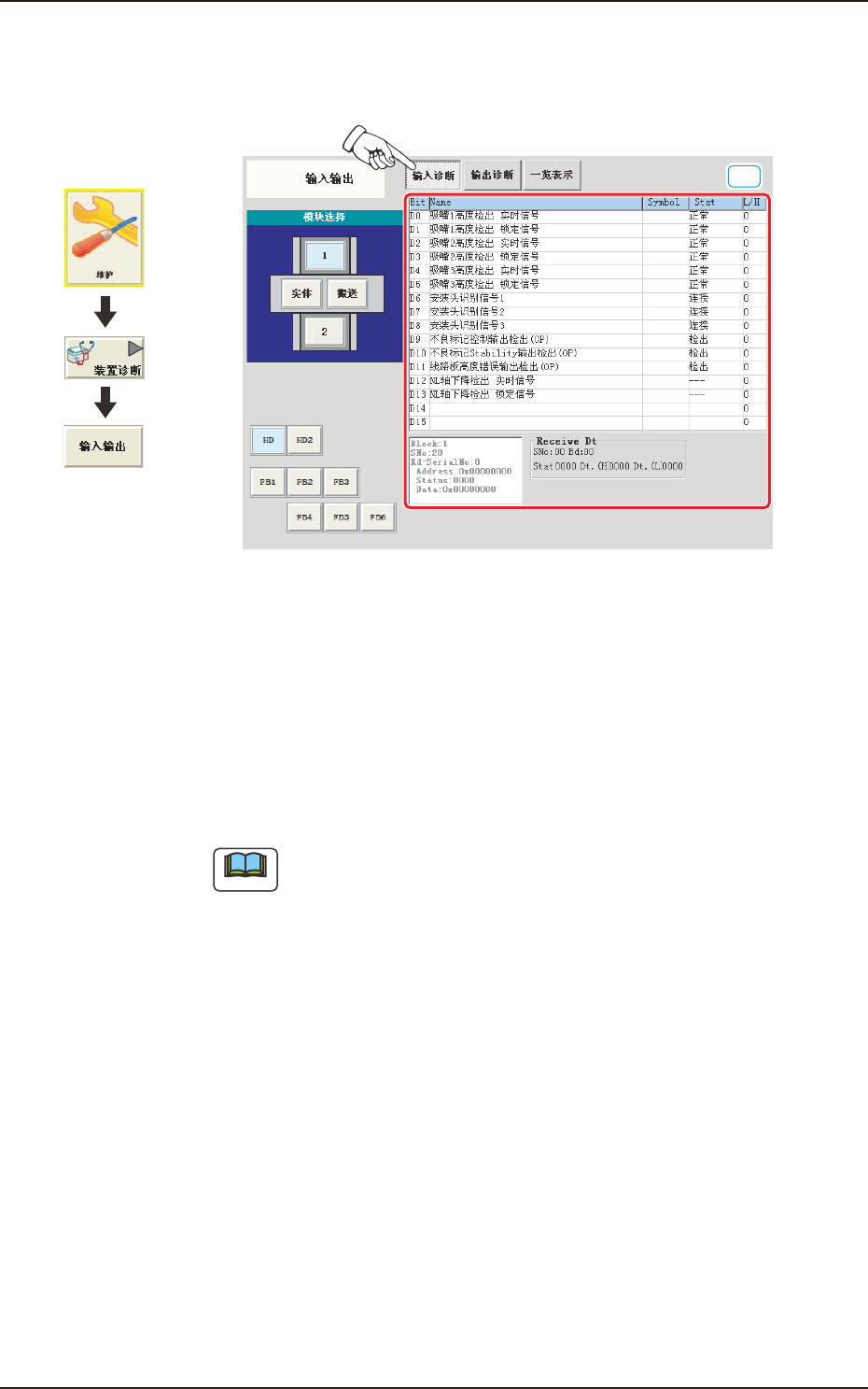 输入诊断 显示用左侧的模块选择按钮及单元选择按钮选择的单元各传感器的输