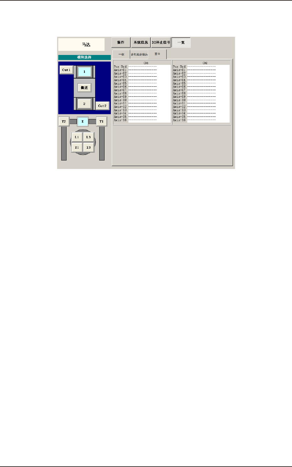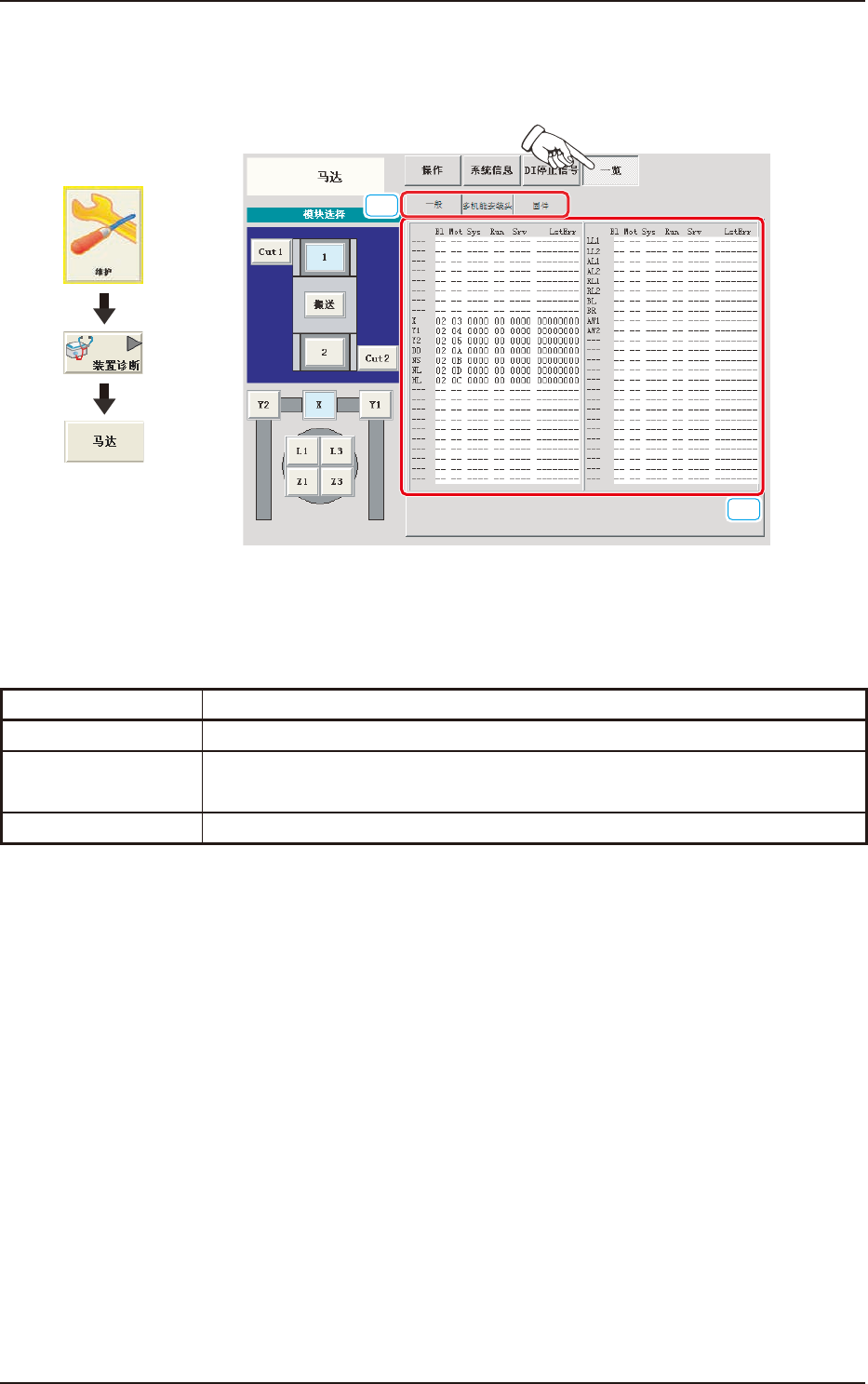 3OM-1752 1-84 1304-001 [2] 状态显示 显示各部分的状态。 (1) 一般 在 “ 一览 ” 界面,按下 [ 一般 ] 按钮,便显示 “ 一览 ” 界面。 F3A69 (2) 多机能 ( 多功能 ) 安装头 在 “ 一览 ” 界面,按下 [ 多机能安装头 ] 按钮,便显示 “ 多机能 安装头 ” 界面。 F3A70 6.2 马 达