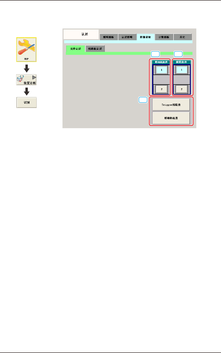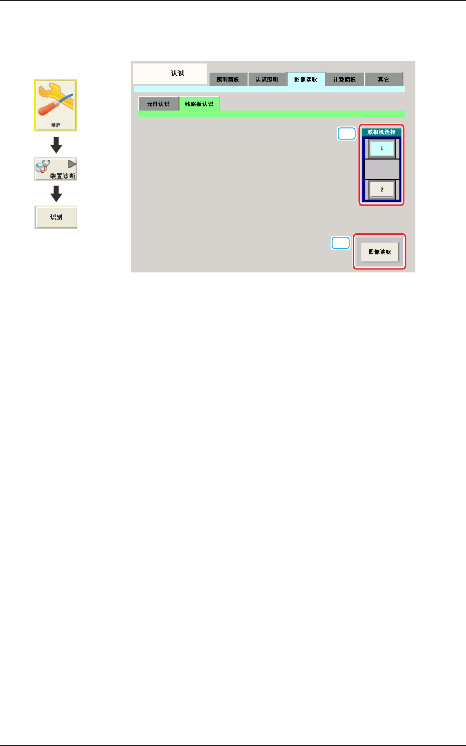 3OM-1752 1-94 6.3.3.2 线路板认识 ( 识别 ) 在 “ 图像读取 ” 选项卡,按下 [ 线路板认识 ]Tab,便显示以下界面。 [1] [2] F3A79 [1] 照相机选择 配置有表示线路板识别照相机位置的按钮。 选择进行图像读取的线路板识别照相机。 [2] [ 图像读取 ] 按钮 用选择的照相机读取图像。 界面展开 1304-001 6.3 认识 ( 识别 )