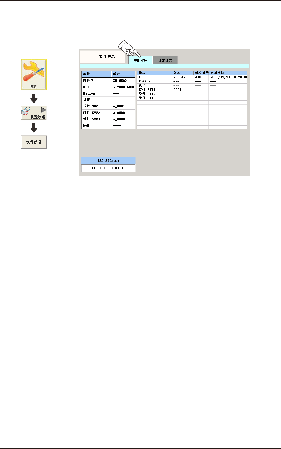 显示每个模块的应用程序版本、应用程序更新时间、MACAddress。