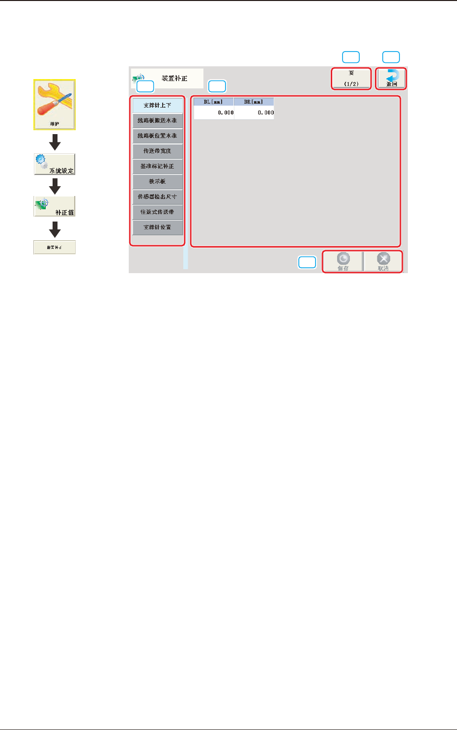 3OM-1752 2-4 1304-001 2.1 装置补正 ( 补正值 ) 2.1 装置补正 ( 补正值 ) [1] [2] [4] [3] [5] F3B3 [1] 补正值选择 Tab 显示选中的补正值数据。 [2] 补正值数据显示部 显示 [1] 中选中的补正值数据。 [3] 页切换按钮 切换补正值编辑界面的页。 [4] [ 返回 ] 按钮 返回到 “ 补正值数据 ” 界面。 [5] [ 保存 ] 按钮 保存输入的数据。 [取 消…