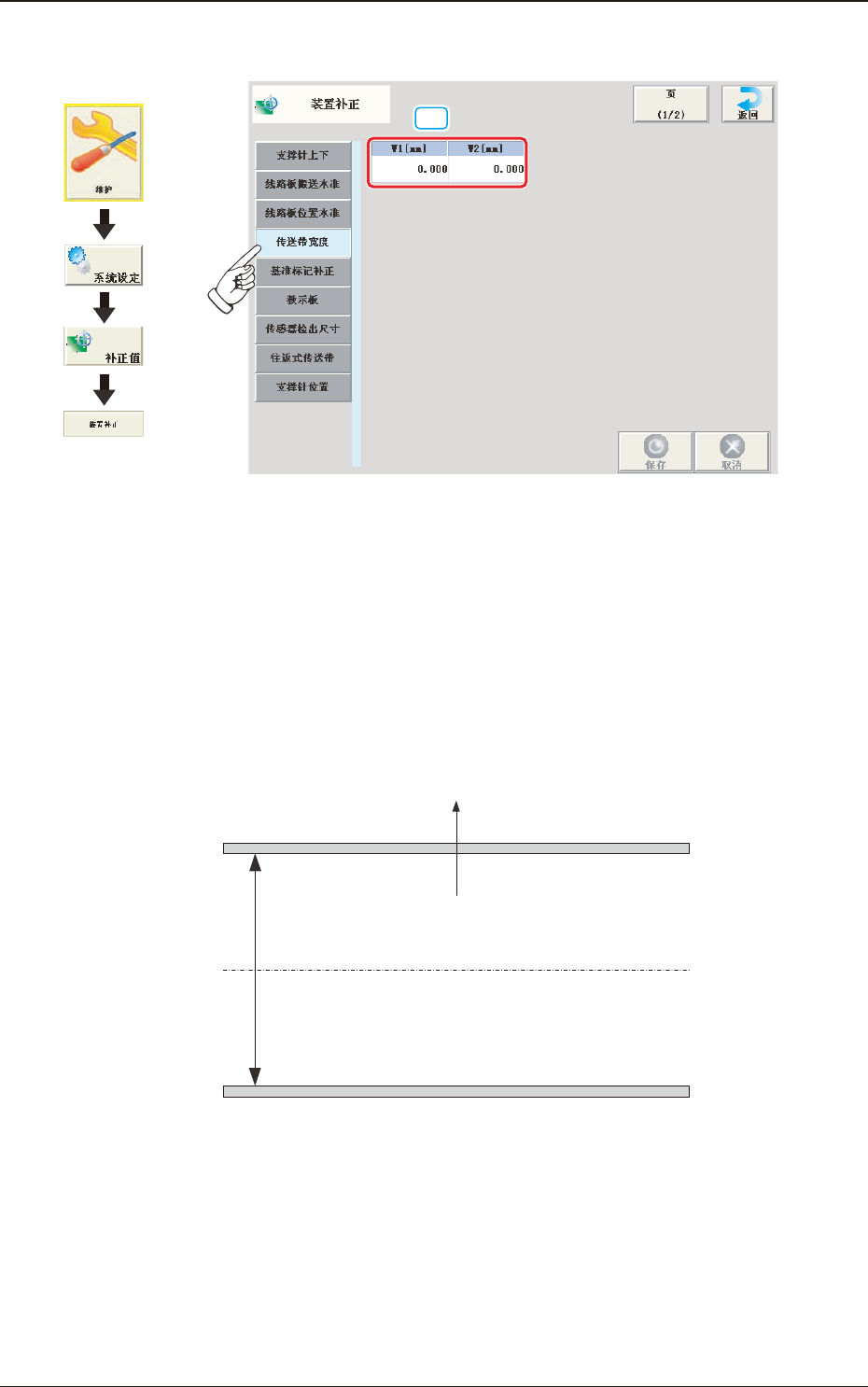 输入在定位中心设置传送带宽度为数据指定宽度时的装置定位中心到