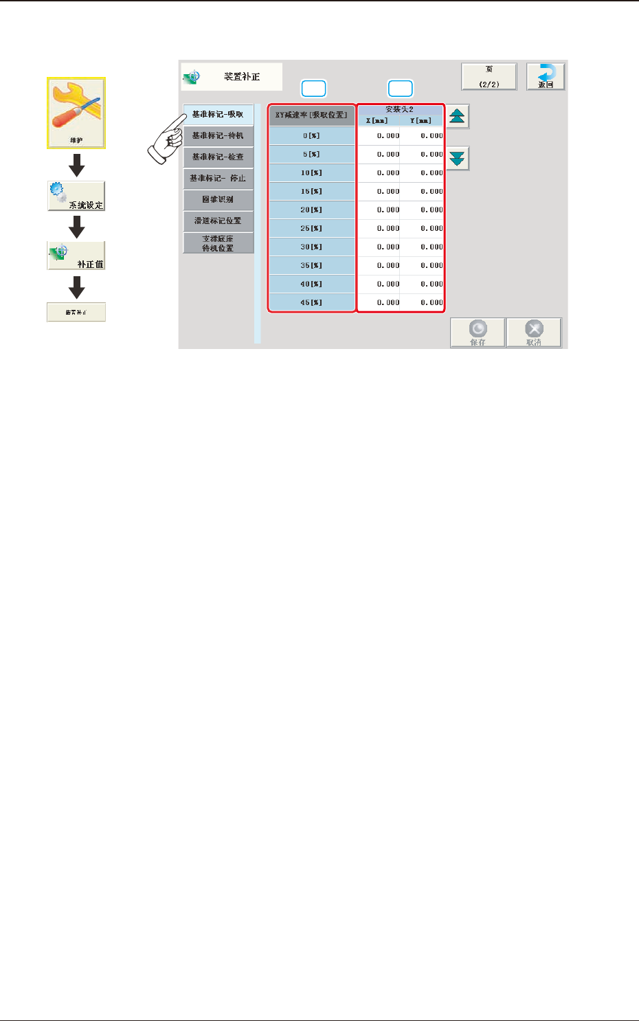 对从基准标记移动到吸取位置时 XY 减速率的安装头 X、Y 偏离进行补