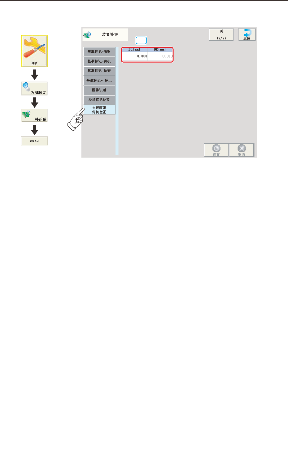 3OM-1752 2-21 1304-001 2.2 送料器安装台 2.2 送料器安装台 [1] [2] [3] F3B22 [1] L 是调整对送料器安装台 1、2 的设计尺寸的高度方向偏离的补正值数据。 设置的送料器安装台低于设计值时,正输入。 Note 以标记 ( 左 )XY、标记 ( 右 )XY 值为基准,算出送料器安装台的线路 板定位部的倾斜度。 [2] [ 返回 ] 按钮 返回到 “ 补正值数据 ” 界面。 [3] [ 适用…