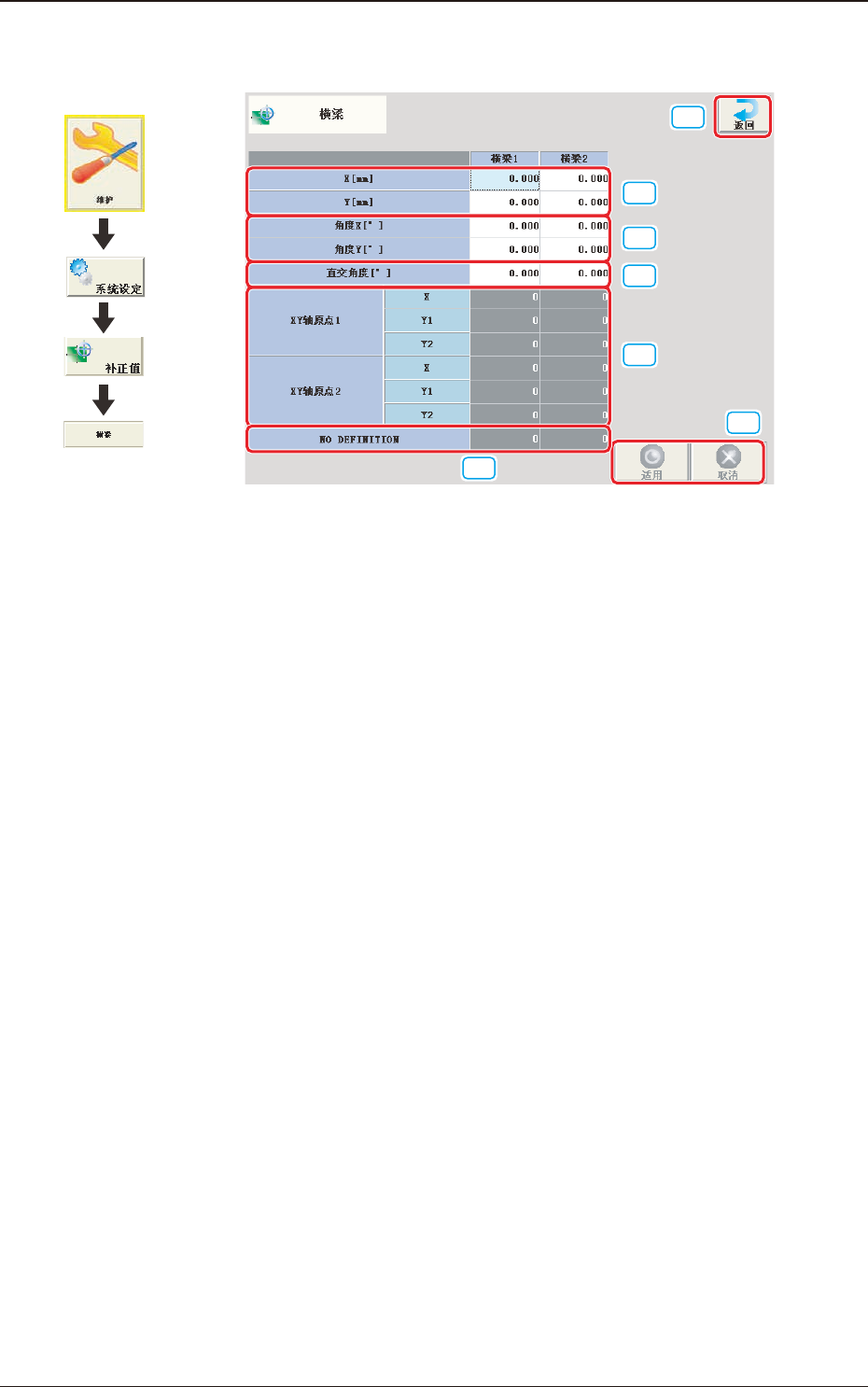 将横梁 X 及 Y 轴对准装置基准坐标系的数据。