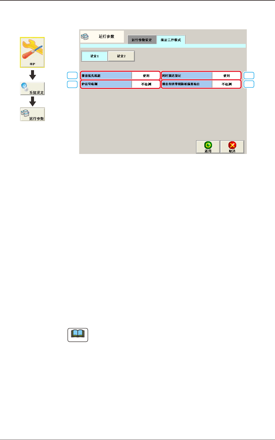 3OM-1752 2-77 1304-001 3.1 运行参数设定 切换设定 [ 分 ] 如设定时间、待机以及停止时间持续,便再次进行减速控制。 [3] 封口盖带满预告 机 能(功 能) 从元件数据库数据的元件供给数据 ( 料带传送、传送间距、种类 ) 决 定的计数开始计算切割碎屑量,进行切割碎屑满预告或装置停止处理。 设定 “ 使用 ” 或 “ 不使用 ” 。 确认间隔 从以下选择。 每 1000mm 每 500mm 每 300mm …