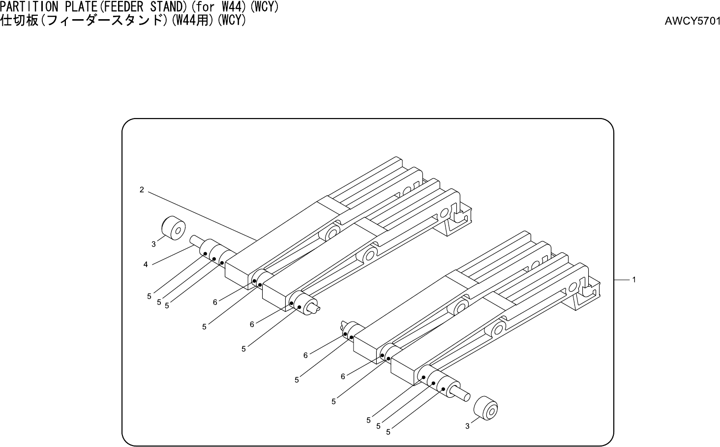 PARTITION PLATE(FEEDER STAND)(for W44)(WCY) 仕切板(フィーダースタンド)(W44用)(WCY) AWCY5701 番号 図番 & コード番号 個数 品名 規格 材質 備考 No. Drg.No. & Code No. QTY Description Rating Materials Remarks 1 AWCY5701 1 RACK ラック OT 2 WCY0222 16 P…