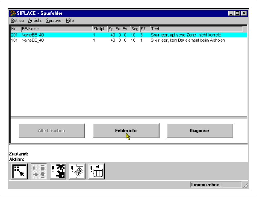Spurfehler). Im Anzeigebereich werden alle aufgetretenen Fehler der aktuellen Fehlerart auf-