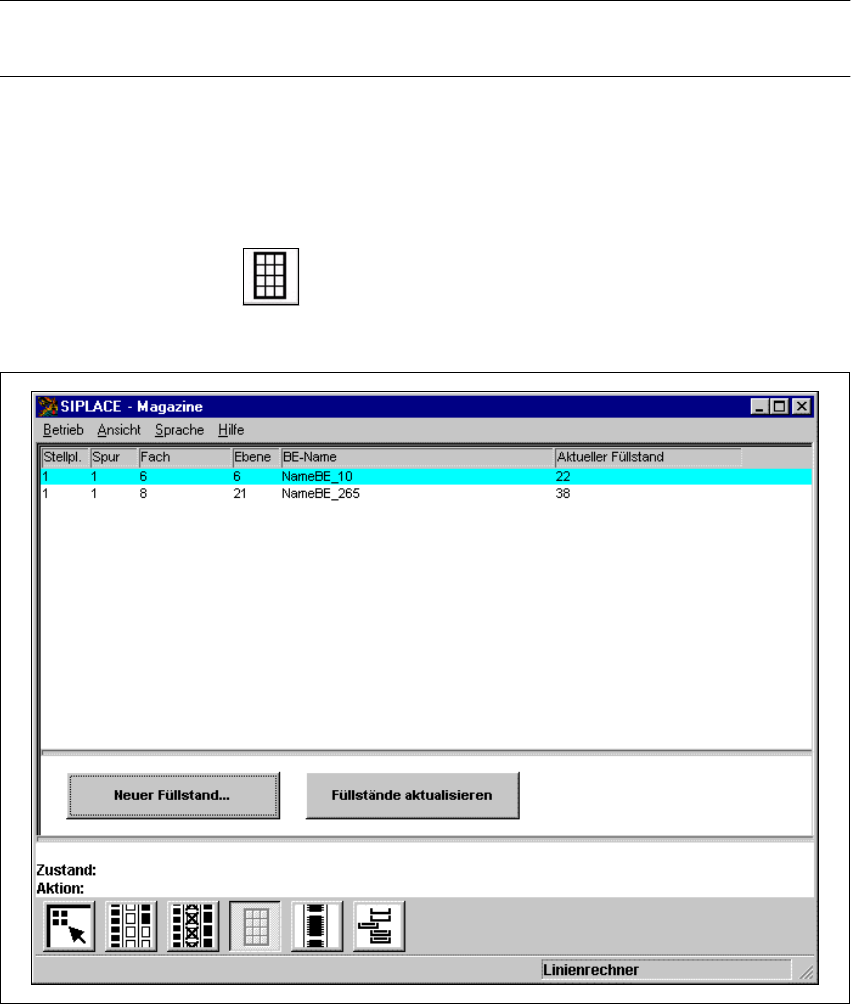 Betriebsanleitung SIPLACE 80S-20/F4 4 Bestückfunktionen Softwareversion SR.406.xx Ausgabe 02/2000 DE 4.3 Förderer 165 4.3.3.1 Füllstände aktualisie ren Å Klic ken Si e die Scha ltfläch e Füllstände akt ualisieren an. Der…