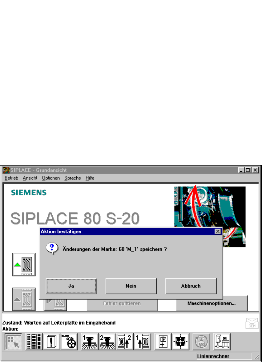 Betriebsanleitung SIPLACE 80S-20/F4 6 Visionfunktionen Softwareversion SR.406.xx Ausgabe 02/2000 DE 6.5 Marke teachen 243 Durch di e W ah l der Op tion ’ Marke spei chern’ veranlas sen Sie den S tatio nsrechn er , die Ma…