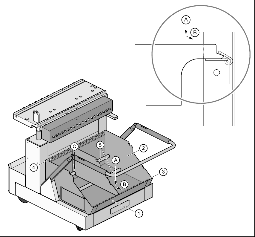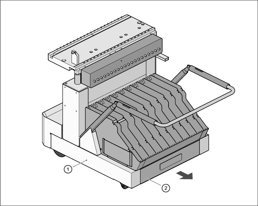 (1) BE-Wechseltisch, fahrbar (2) Gurtabfallbehälter, herausziehbar