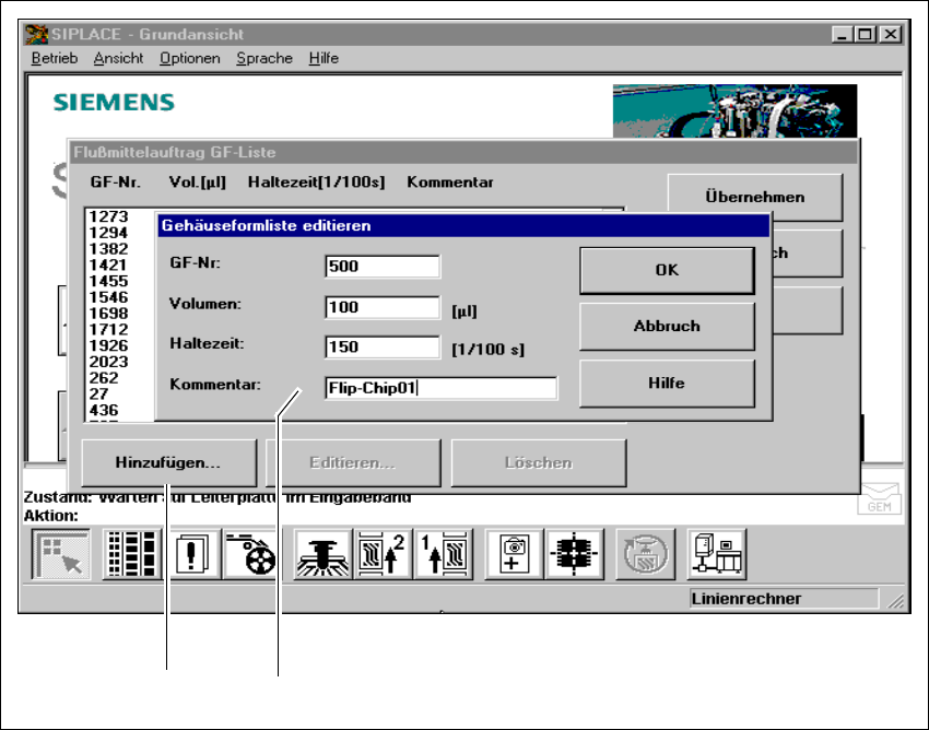 Betriebsanleitung SIPLACE 80S-20/F4 11 Stationserweiterungen / Hardware Softwareversion SR.406.xx Ausgabe 02/2000 DE 11.9 Dispens-Flussmittelauftrag (80F4) 503 1 1.9.7. 2 GF- Liste bearbeiten Å Wähl en Sie da s Menü „GF-…