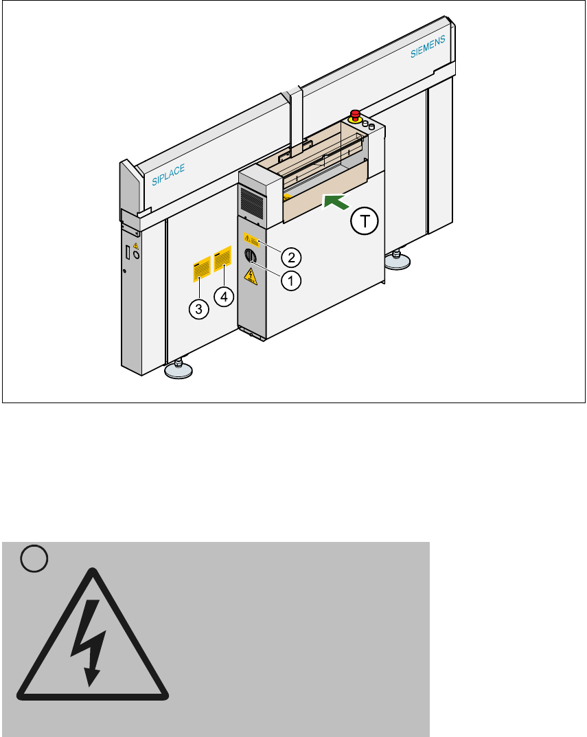 Betriebsanleitung SIPLACE 80S-20/F4 2 Betriebssicherheit Softwareversion SR.406.xx Ausgabe 02/2000 DE 2.1 Sicherheitshinweise 69 2 Abb. 2.1 - 2 Warnschilder an der Grundmaschine - T eil 2 (1) Hauptsch alter T LP-T r ansp…