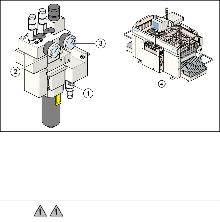 2 Betriebssicherheit Betriebsanleitung SIPLACE 80S-20/F4 2.4 Sperren der Druckluftzufuhr und Druckabbau Softwareversion SR.406.xx Ausgab e 02/2000 DE 100 2.4 Sperren der Druckluftzufuhr und Druckabbau Der Betrieb sdruck …