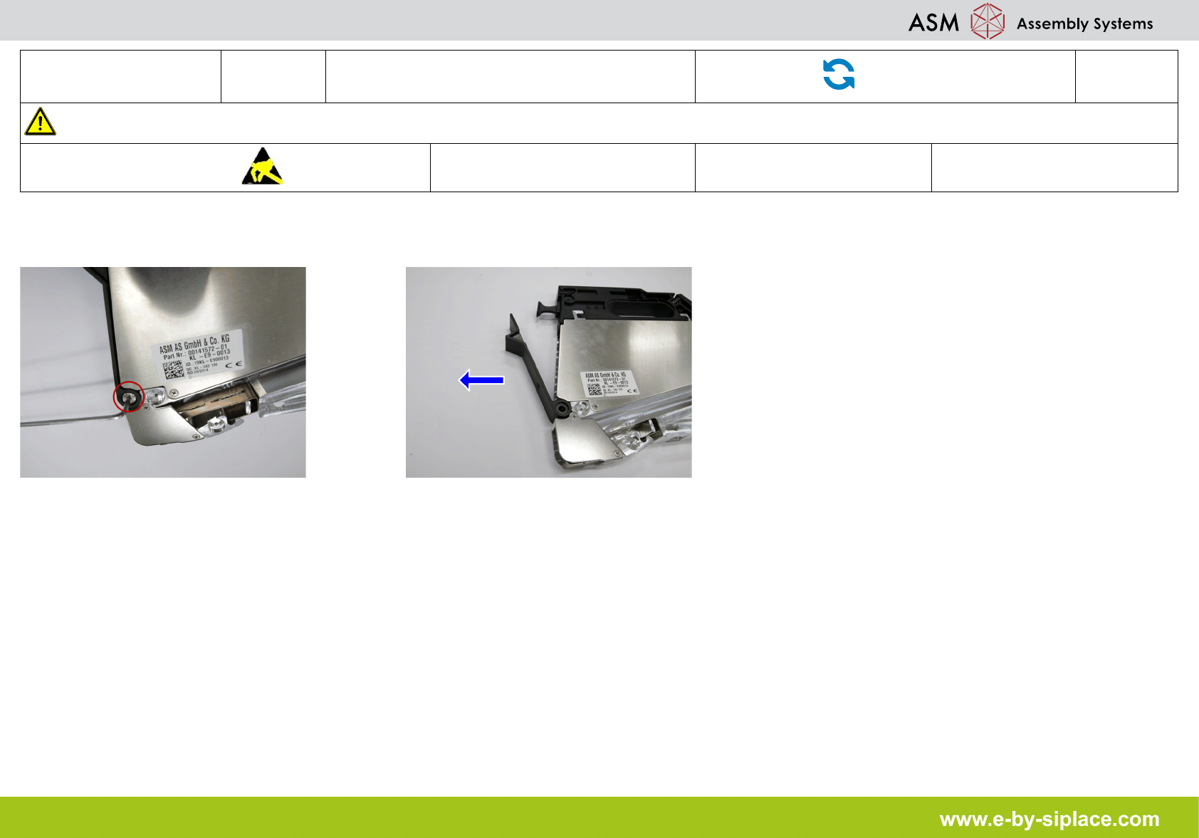 E-by SIPLACE Smart Feeder 16 mm E Fitting the Tape Disposal Flap Part Exchange 2/2 CAUTION! Refer to safety inst ructions in user manual before working on the machine. ESD guidelines are to be followed Tool: T1 Part No.:…
