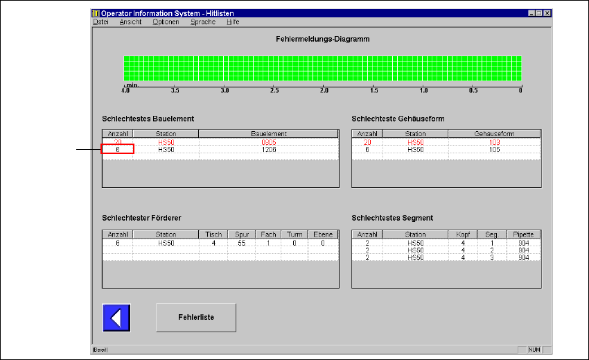 sind beispielsweise für das Bauelement 1206 an der Station HS50 sechs Fehlermeldungen ein-