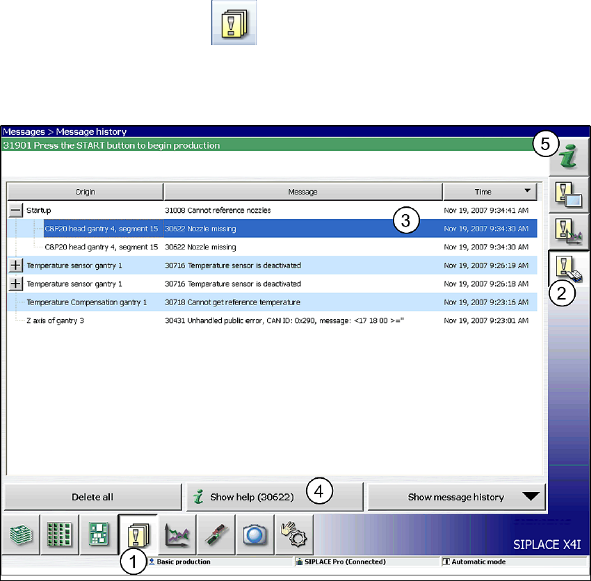 Kasutusjuhend SIPLACE X-Seeria 5 Masinaga töötamine Alates tarkvaraversioonist 706.1 SP1 Versioon 10/2014 5.6 Alarmii nfo ja onlain-abi 287 5 Jn 5.6 - 1 Vaade "Tootmine" koos ala rmiteatega (SIPLACE X4i näit el…