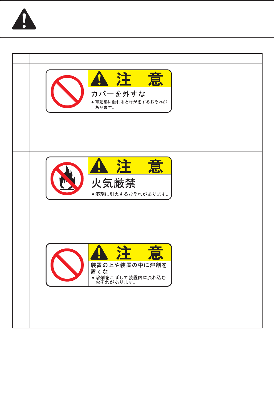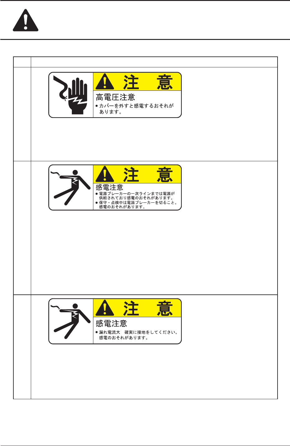 安全にお取扱いいただくために No 警告ラベルと説明 (8) 説 明 カバーを外さないでください。 カバーを外すと感電するおそれがあります。 (9) 説 明 電源ブレーカーの一次ラインまでは電源が供給されており、感電のおそれ があります。 装置の保守・点検 ( 清掃、給油または調整など ) を行う場合は、保守係 に定められた人が定められた手順に従って、必ず装置の電源およびエア源 を切ってから行ってください。 通電中に保守・点…