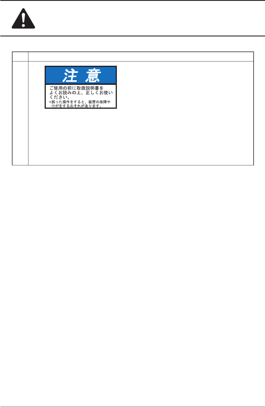 安全にお取扱いいただくために No 警告ラベルと説明 (17) 説 明 インターロックを解除すると、 可動部によりけがをするおそれがあります。 (18) 説 明 装置の運転操作または保守のトレーニングを受けた人以外は、装置をさわ らないでください。 装置が故障するおそれがあります。 (19) 説 明 装置を運送する場合は、フォークやキャッチパレットを装置前面から挿入 してください。 装置後面や装置側面から挿入すると、 電装部…