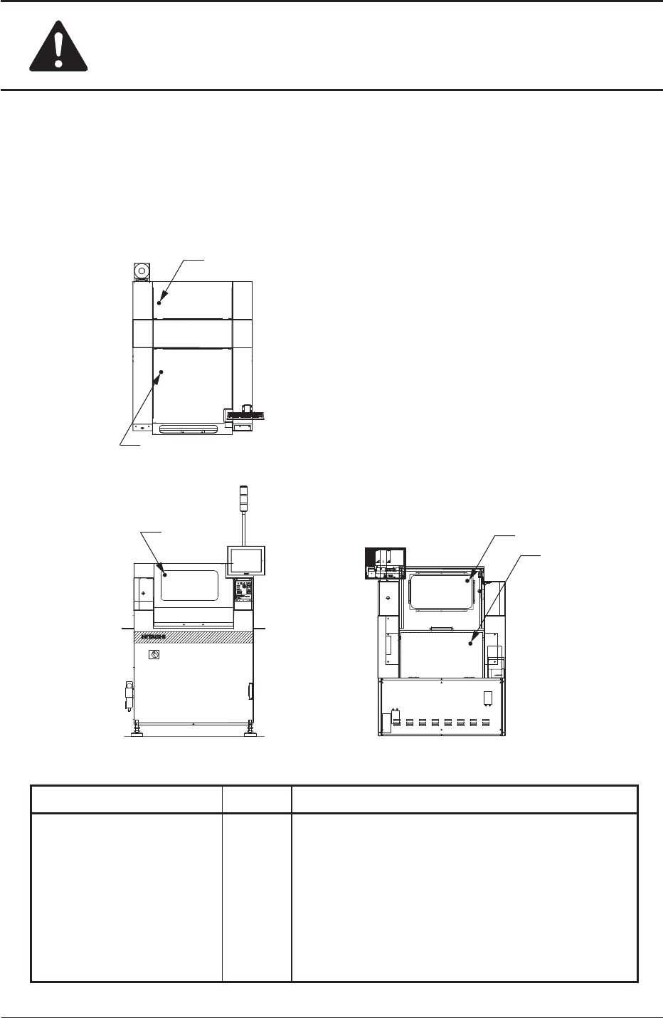 安全にお取扱いいただくために 0703-003 [ 開閉扉確認 ] スイッチ [ 運転モード / 段取 ] スイッチが“運転モード”側に設定されているとき開閉扉 を開けると、このスイッチが作動して異常表示をします。 “段取”側に設定されている場合は、このスイッチは作動しません。 S12 S13 S12 S14 S13 装置上面 装置前面 装置後面 スイッチ名 記号 装 置 処 置 [ 開閉扉確認 ] スイッチ S12 S13 S14 開…