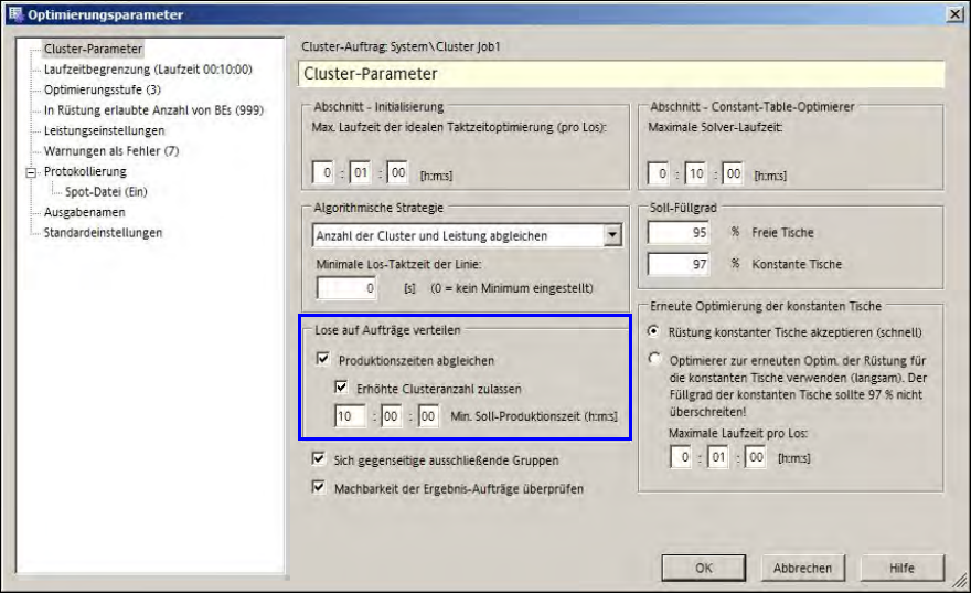 ● Mit der Option Produktionszeiten abgleichen unter Cluster-Parameter wird versucht,