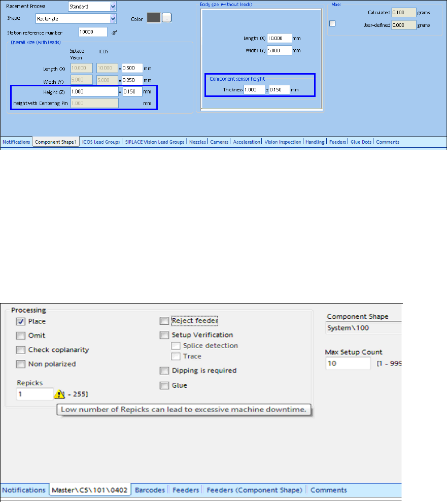 Figure 4-4: Height entries in the Component Shape Editor