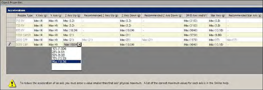 The percentage values refer to the maximum acceleration of the possible placement heads. The