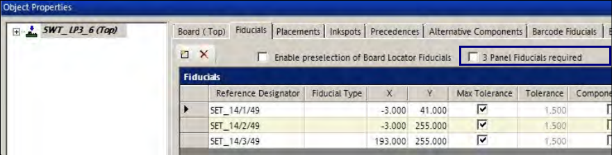 As of this SIPLACE Pro version, the 3 Panel Fiducials required object property can be set for a