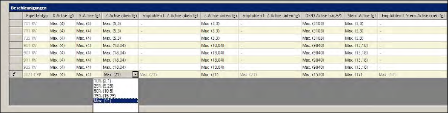 Die Prozentwerte beziehen sich auf die maximale Beschleunigung der möglichen Bestückköpfe.