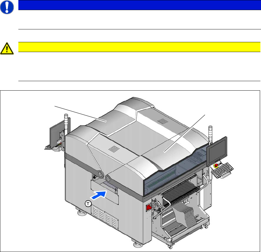 《用户手册》 E by SIPLACE 2 操作安全 使用软件版本 SC 712.1 或更新 2019 年 5 月版 2.7 安全功能 77 2.7 安全功能 2.7.1 保护盖 保护罩和保护盖作为保护装置, 可以防止未经授权的人员接触到贴片机内部。 2 2 2 图 2.7 - 1 保护盖 (1) 1 号料位的保护盖 (2) 2 号料位的保护盖 悬臂的行程范围用两个可以打开 的保护盖加以保护 (项目 1 和 2) 。 请注意 检查 / …