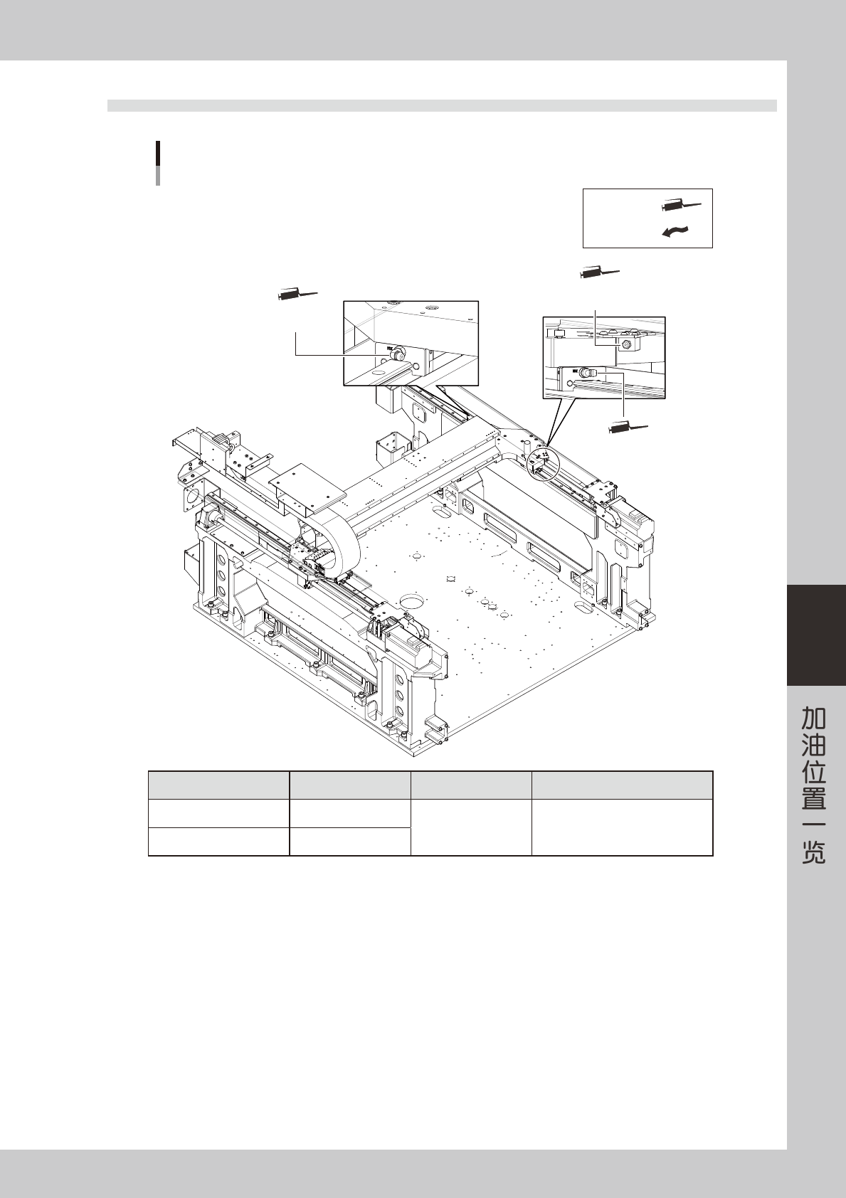 5-4 5 2.3 W 轴导轨、滚珠丝杆与六角轴 W轴的加油位置 润滑油枪 : 用手涂抹 : W轴滚珠丝杆 W轴导轨部 润滑油注油嘴 W轴滚珠丝杆 6角轴 加油部位 加油位置 频率 加油方法 导轨 2 1 次 / 年 润滑油枪 : 弯折型枪嘴 滚珠丝杆 2 用手涂抹 六 角轴 1 用 手 涂抹 55503-M9-00