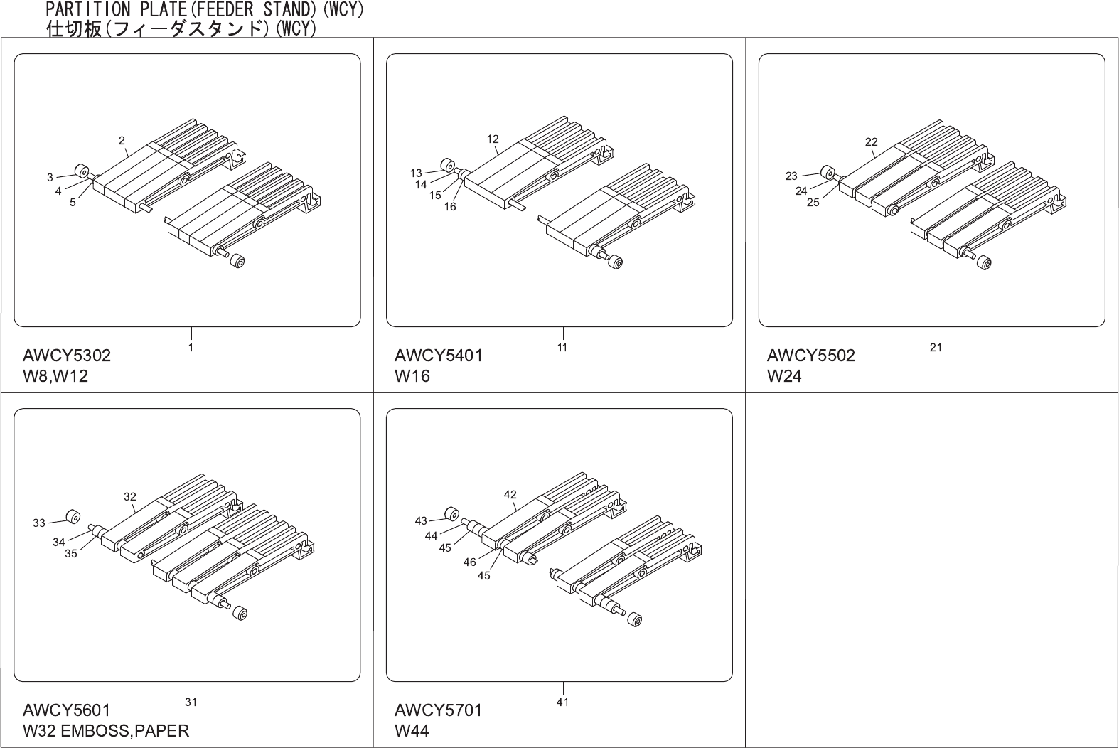 FEEDER STAND DOUBLE RACK TYPE(WCY) フィーダスタンド 2段タイプ(WCY) AWCY6203 No. Drg.No. & Code No. QTY Description Rating Materials Remarks 番号 図番 & コード番号 個 数 品名 規格 材質 備考 1 WCY0461 1 STAND スタンド FE 2 WCY0471 1 STAND スタンド FE 3…