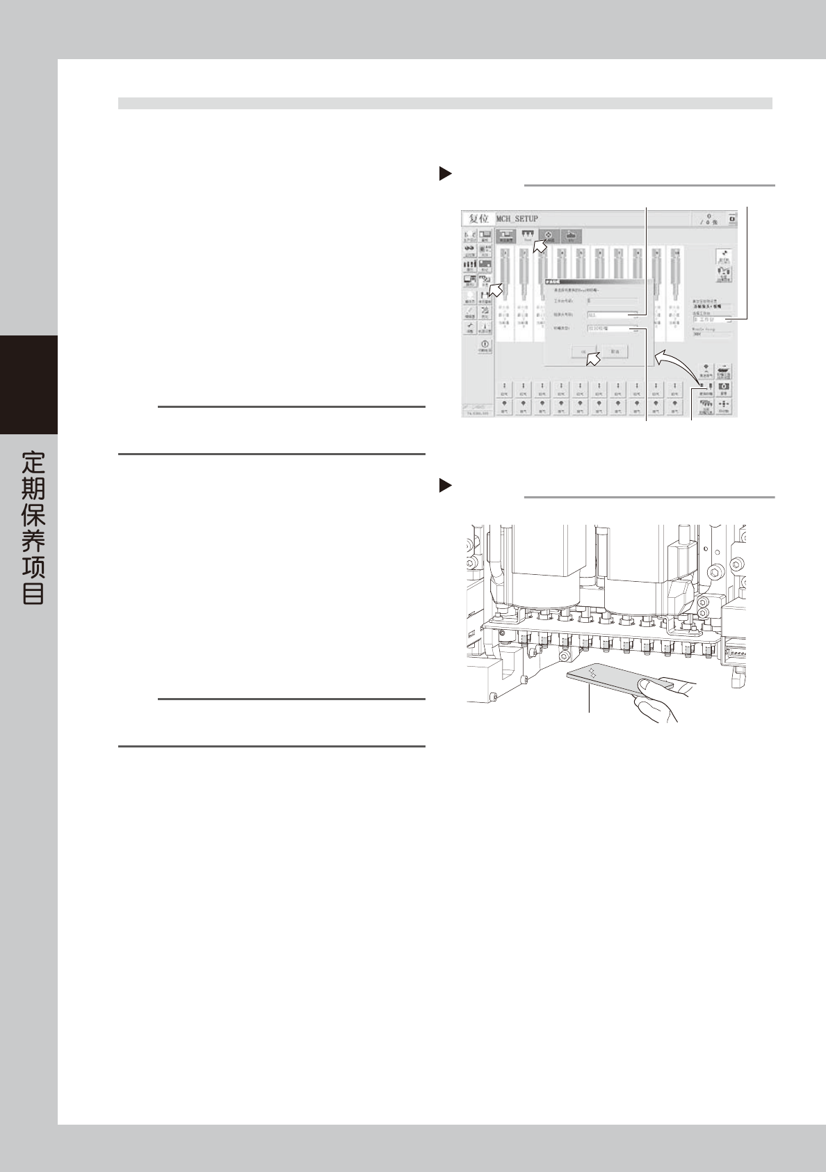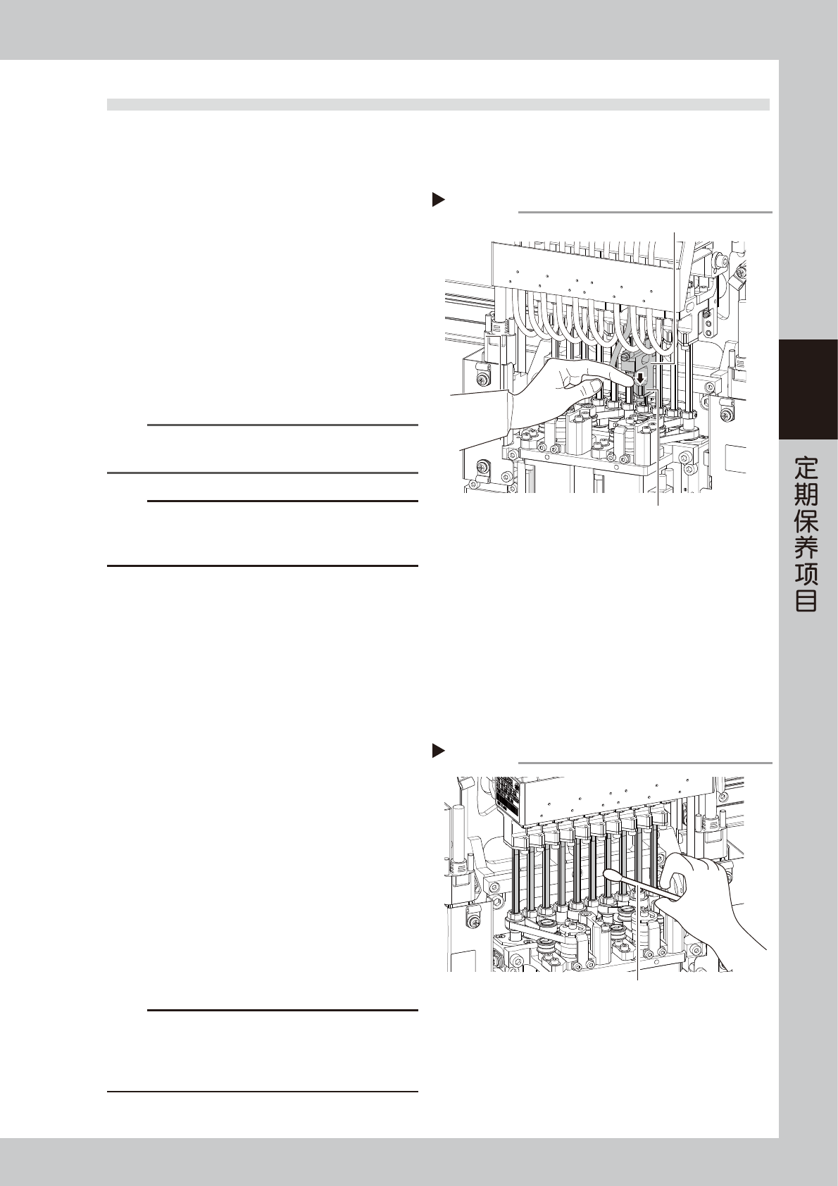 3-25 3 3.5 Z 轴的点检、清洁与加油 ( HM 贴装头 ) 3.5.1 花键轴 Z 轴的动作确认 下面,介绍 HM 贴装头的花键轴 Z 轴的运行动作确认方法。 1 e 将贴装头单元移到贴片机的正面侧。 1. 按急停按钮之后,打开贴片机正面的安全机盖。 2. 使用一次性换料车的机型,需将料车从贴片机 上拆下。 3. 用移动把手将贴装头单元移到贴片机正面一侧。 2 使花键轴 Z 轴上下移动。 用手指按压 Z 轴的接头块下部,使 Z…