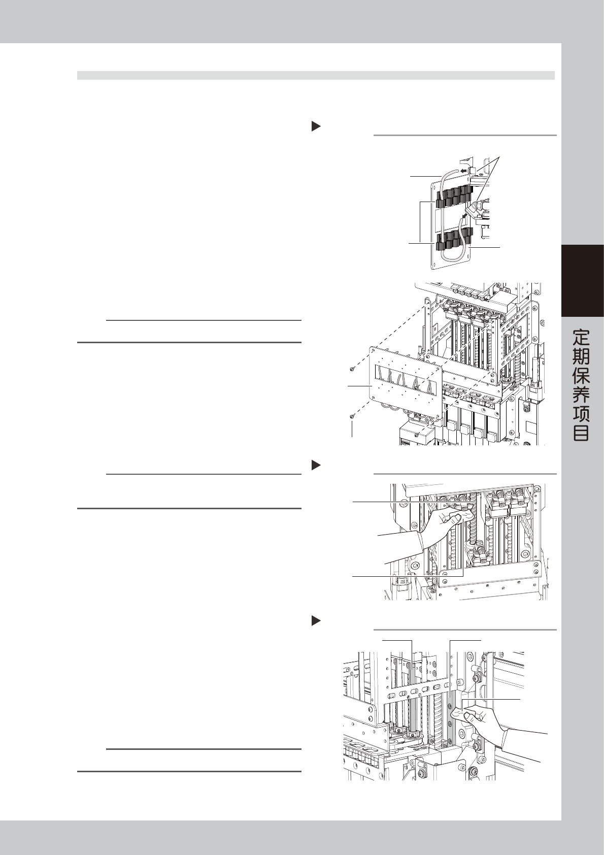 3-26 3 3.5.3 给花键轴加油 ( 需要时 ) n 要点 HM 贴装头单元的花键轴 (Z 轴 ) 基本上无需加油。但,若用手触摸过或溶剂等溅到轴表面而失去润滑油时,轴表面容易生锈。 因此,请根据需要,涂抹一层薄薄的指定润滑油 (NSL) 以防止生锈。 1 e 将贴装头单元移到贴片机的正面侧。 1. 按急停按钮之后,打开贴片机正面的安全机盖。 2. 使用一次性换料车的机型,需将料车从贴片机上拆下。 3. 用移动把手将贴装头单元移到…