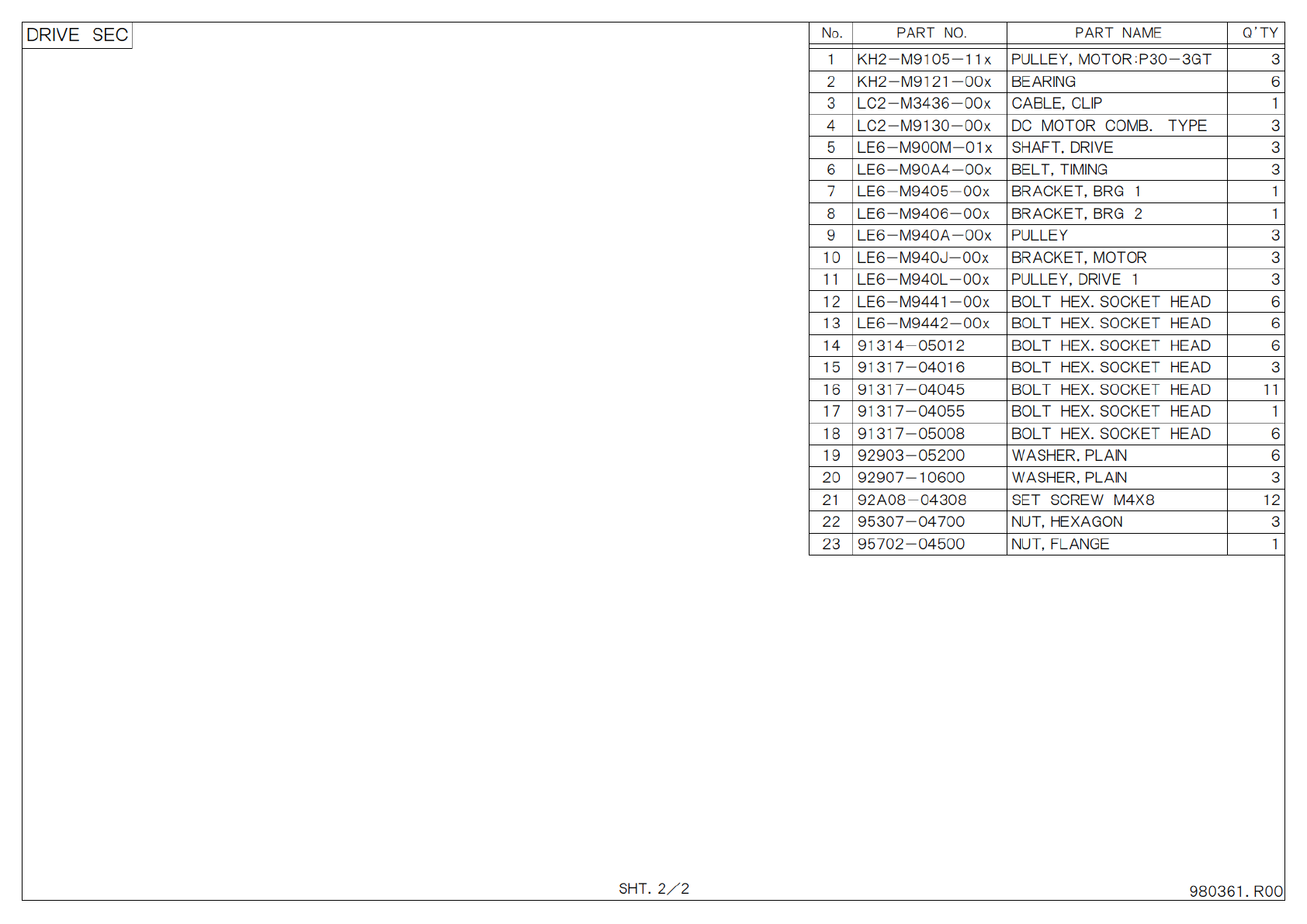 S H T . 2 / 2 P A R T N O . P A R T N A M E Q ’ T Y N o . D R I V E S E C 9 8 0 3 6 1 . R 0 0 1 K H 2 - M 9 1 0 5 - 1 1 x P U L L E Y , M O T O R : P 3 0 - 3 G T 3 2 K H 2 - M 9 1 2 1 - 0 0 x B E A R I N G 6 3 L C 2 - M …