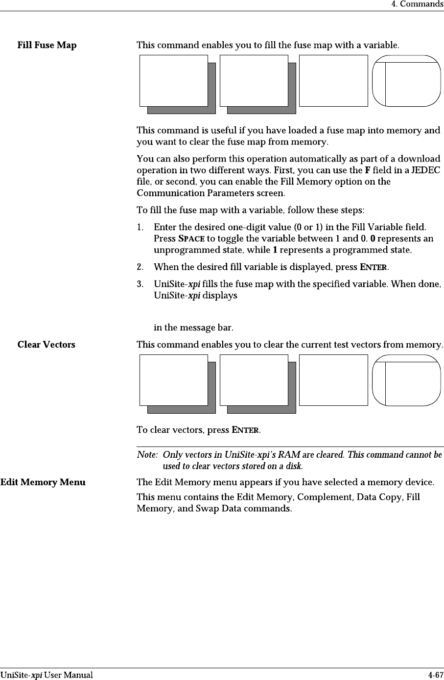 Done Main Menu More Com- mands Edit Data Fill Pro- grammer Fuse Map Main Menu More Com- mands Edit Data Clear V ec- tors