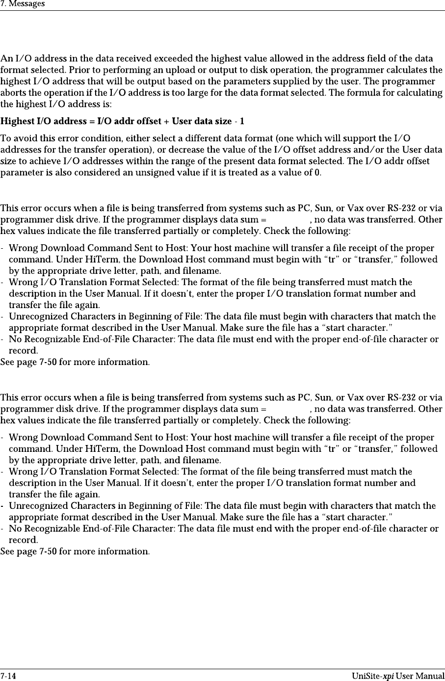 I/O timeout error. Press F3. Data checksum = ssssssss Xmit sum = ssssssss.