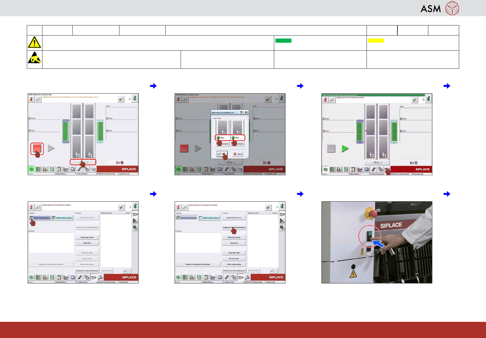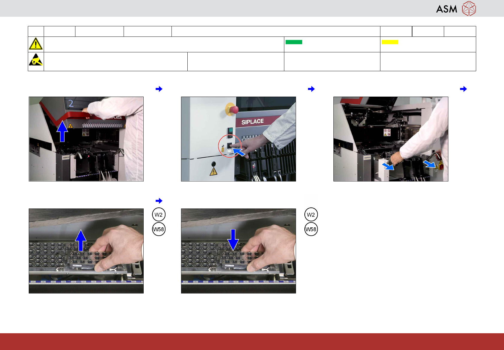 1 WF 1 TX-Series V2 维护 移除料台 (COT) 并更换所有吸嘴 1.5 分钟 1 / 2 注 意 开 始 维 护 前 , 请 参 阅 用 户 手 册 中 的 安 全 说 明 贴片机状态开启 传送导轨 空 注意! 遵守防静电守则 工具 易损件: W2, W58 耗材: www.asm-smt.com 1 停止生产并点击“阻挡传送导轨”图标。 2 阻挡两个轨道并点击“确定”图标。 3 点击“维护”图标。 4 选择所有…