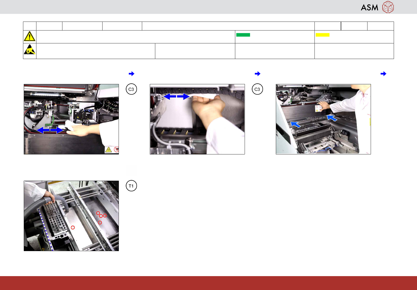 4 WF 1 TX-Series V2 维护 检查并清洁 X 与 Y 轴的磁性表面 1.5 分钟 2 / 2 注 意 开 始 维 护 前 , 请 参 阅 用 户 手 册 中 的 安 全 说 明 贴片机状态 关闭 传送导轨 空 注意! 遵守防静电守则 工具: T3 易损件: 耗材: C3 www.asm-smt.com 7 如果正常,则清洁 Y 轴磁铁。 8 将所有悬臂移到料位 2 的极限位上。 9 为其他悬臂重复第 2-7 步。
