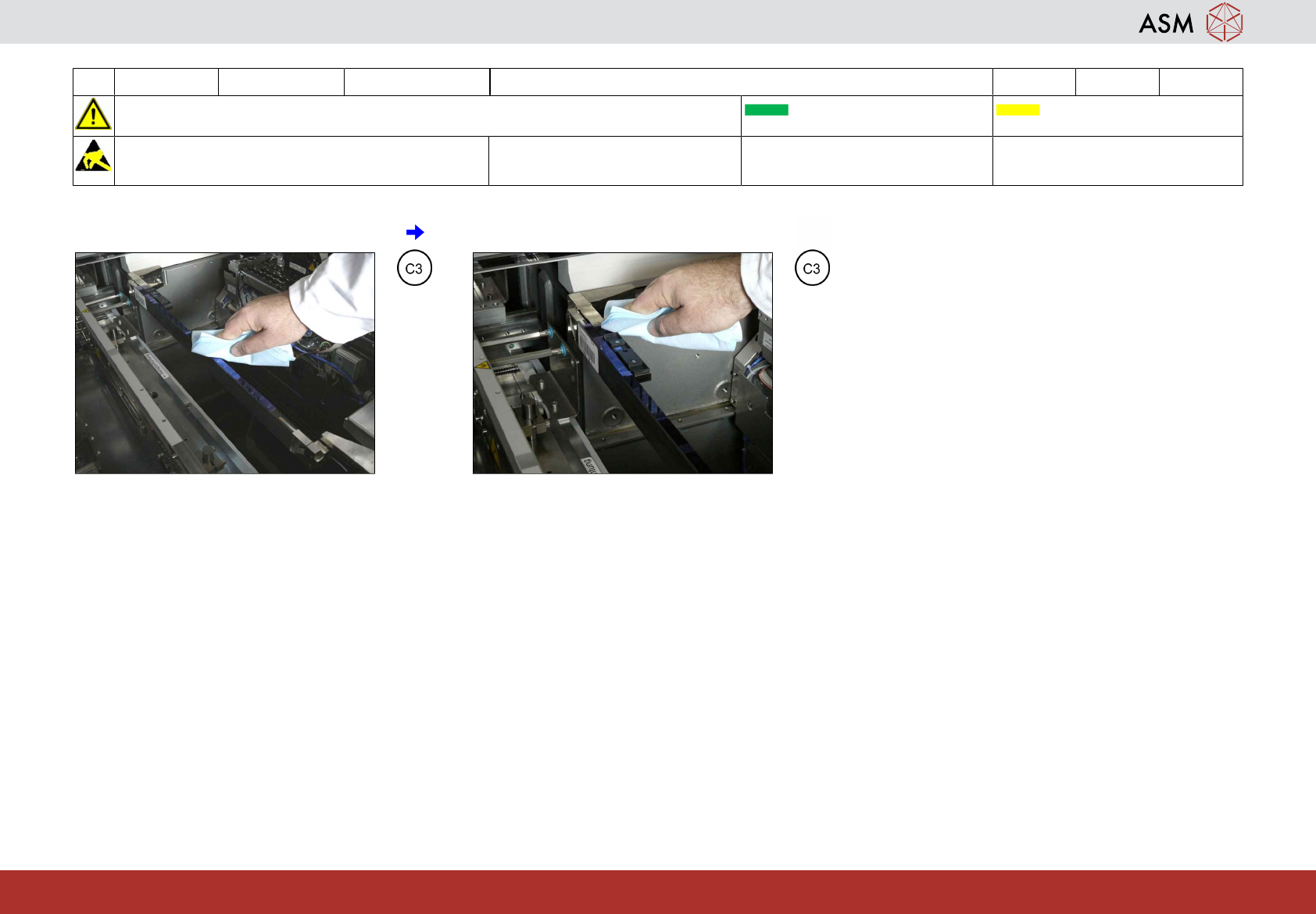 6 WF 1 TX-Series V2 清洁基准杆 (仅限TX V2 micron和HD) 5 分钟 1 / 1 注 意 开 始 维 护 前 , 请 参 阅 用 户 手 册 中 的 安 全 说 明 贴片机状态开启 传送系统空 注意! 遵守防静电守则 工具 易损件: 耗材: C3 www.asm-smt.com 1 小心清洁玻璃轴基准杆上的所有位置。 2 小心清洁校准PCB上的所有位置。