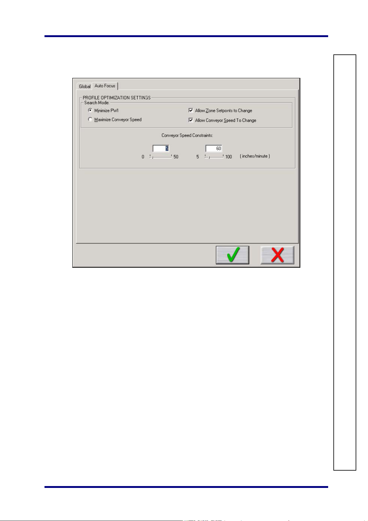 • 允许改变轨道速度(Al low Conveyor Speed to Change) – 选择是否允许Auto-Focus改变传输速度。如